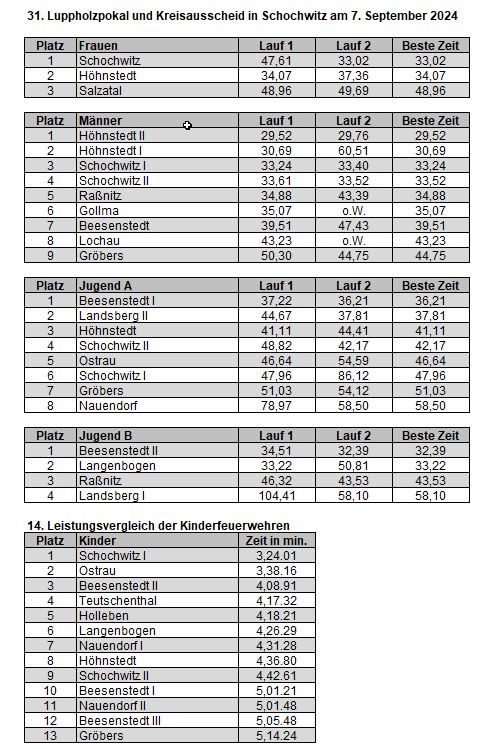 Am ersten Luppholzpokal 1991 nahmen 13 Männer- und 1 Frauenmannschaft teil. Sieger bei den Männern war damals die Freiwillige Feuerwehr Landsberg/ Gütz mit 58 Sekunden.